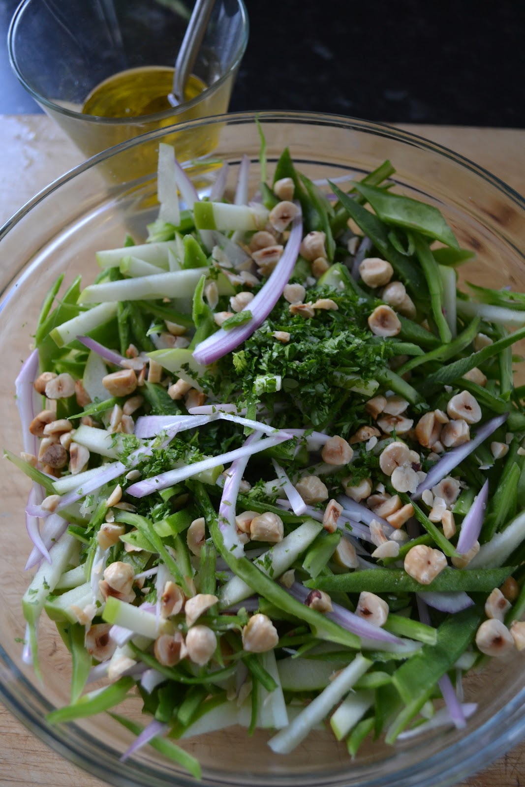 Combine the sliced runner bean, apple and shallot in bowl; add the hazelnuts and parsley combine a bit more.
